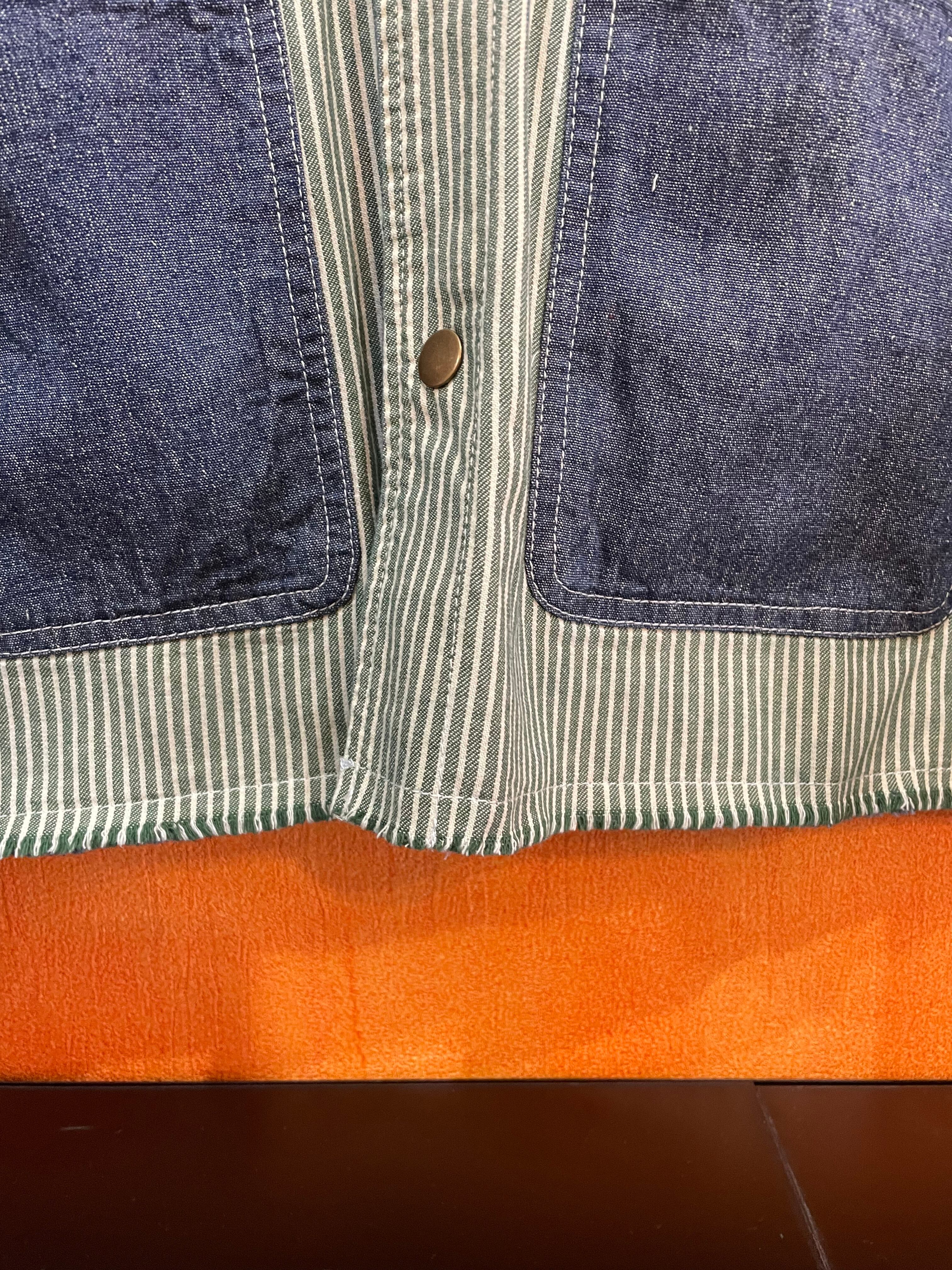 片面には1920年代のワークウェアを彷彿とさせるクラシックなヒッコリーストライプ柄、もう片面にはカジュアルな週末スタイルにぴったりのインディゴ染めデニムを採用