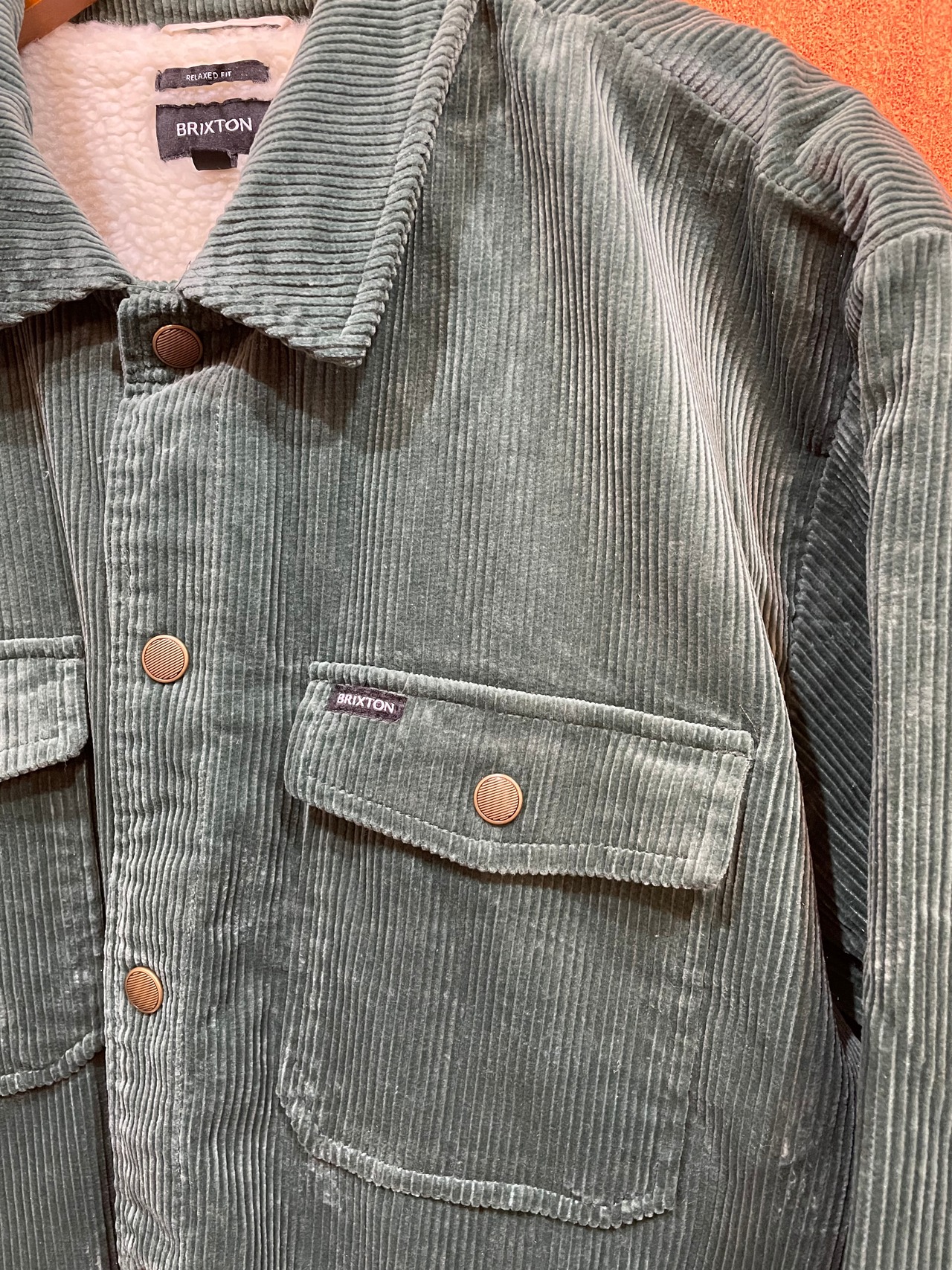 ライナーにはシェルパライニング、袖にはフリースライニングをあしらい、表地は光沢のある8ウォールコーデュロイを採用。