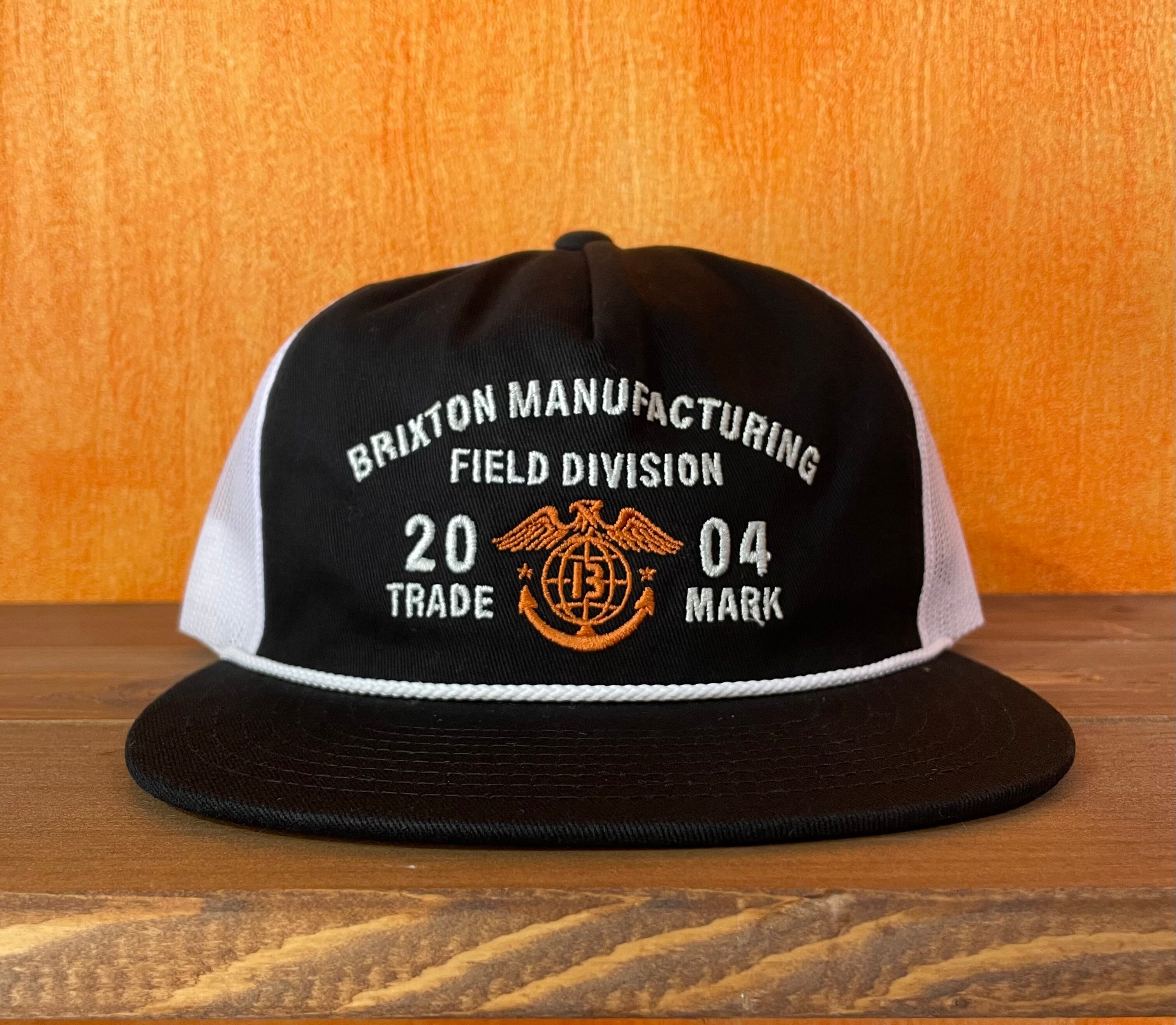 芯なしのフロントパネルに刺繍で落とし込まれたアーミーテイストのロゴがポイントのトラッカーキャップ