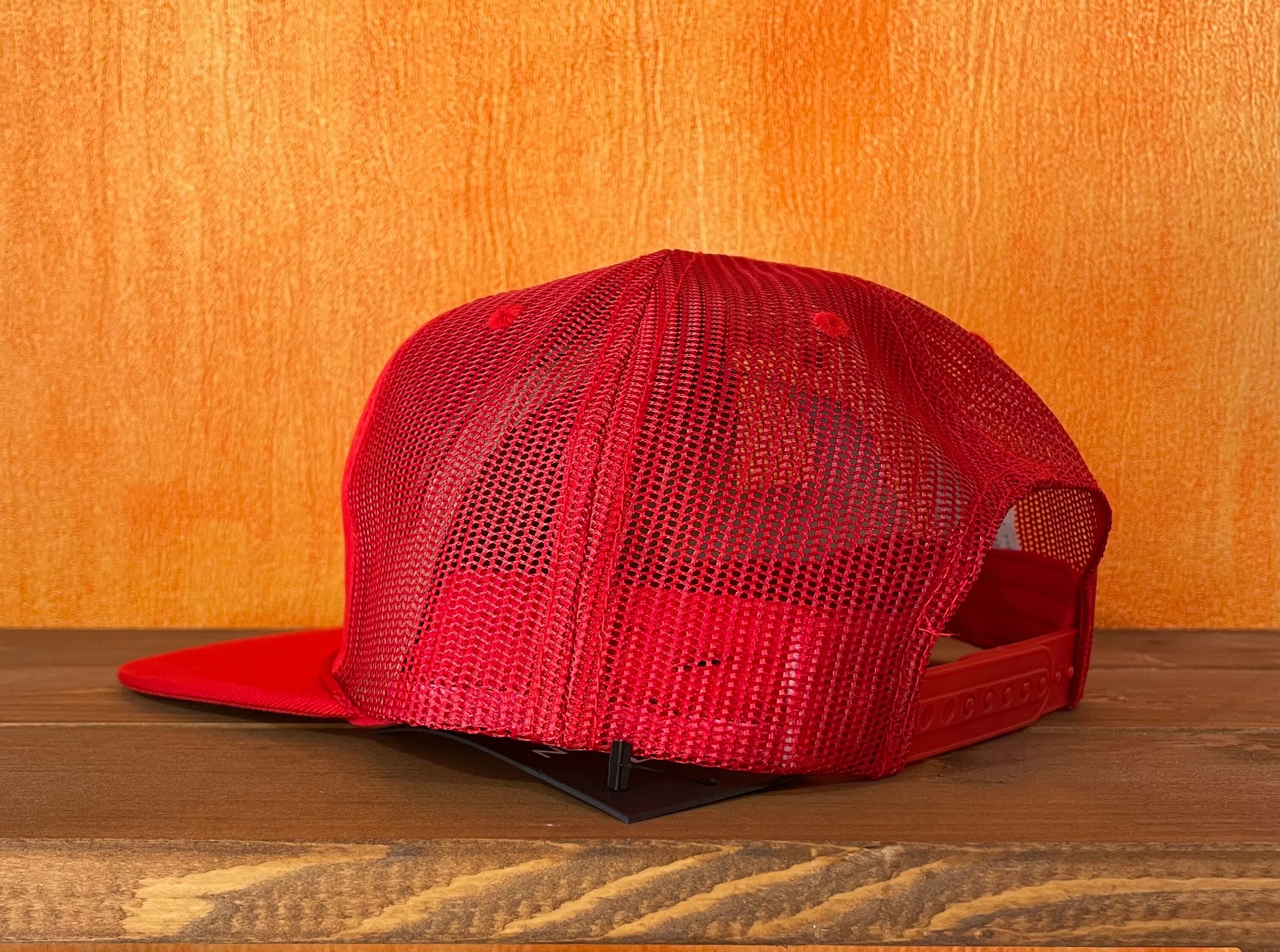 芯なしのフロントパネルに刺繍で落とし込まれたアーミーテイストのロゴがポイントのトラッカーキャップ